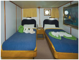 Alojamiento: 8 cabinas dobles cada una con baño privado. Caliente / fría ducha de agua.